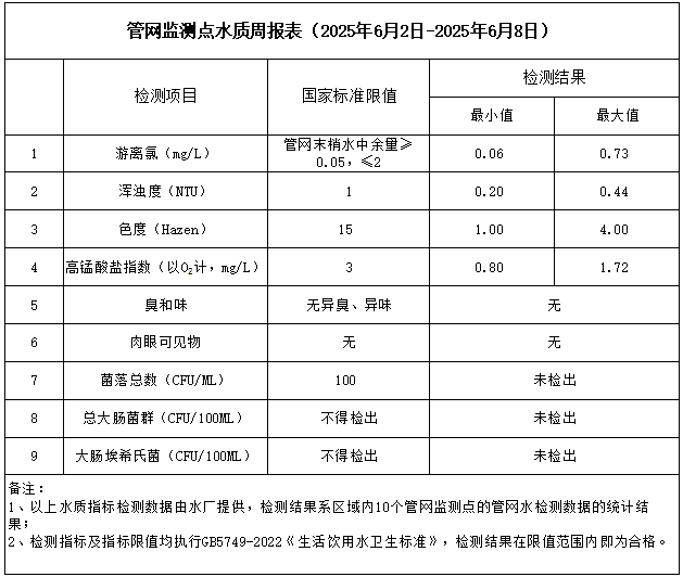 管網監測點水質周報表(2025年6月2日-2025年6月8日)