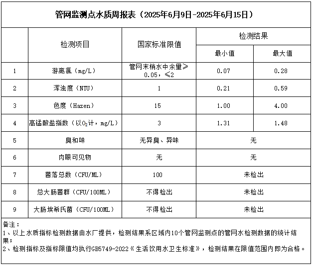 管網監測點水質周報表(2025年6月9日-2025年6月15日)