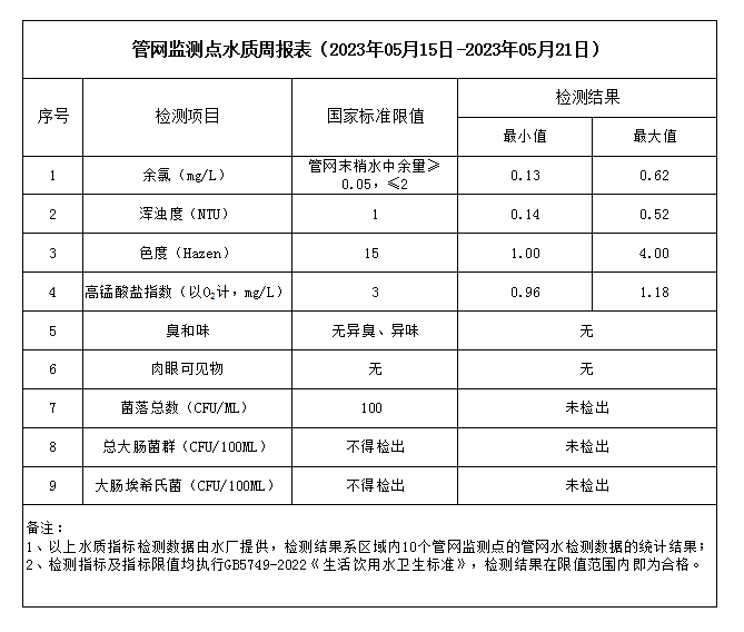 管網(wǎng)監(jiān)測點水質(zhì)周報表(2023年05月15日-2023年05月21日)