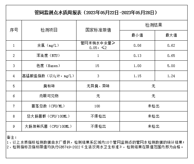管網監測點水質周報表(2023年05月22日-2023年05月28日)