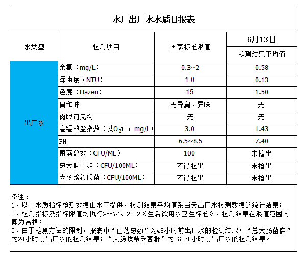 水廠出廠水水質(zhì)日報表(2023-6-13)