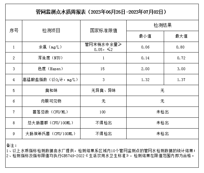 管網監測點水質周報表(2023年06月26日-2023年07月02日)