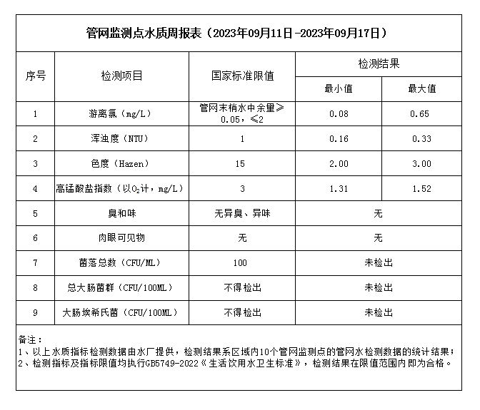 管網(wǎng)監(jiān)測點(diǎn)水質(zhì)周報表(2023年09月11日-2023年09月17日)