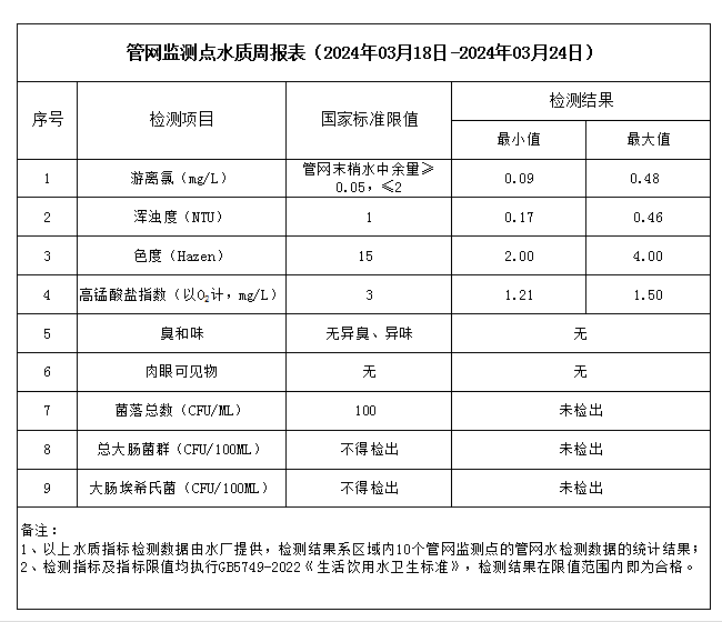 管網監測點水質周報表(2024年03月25日-2024年03月31日)
