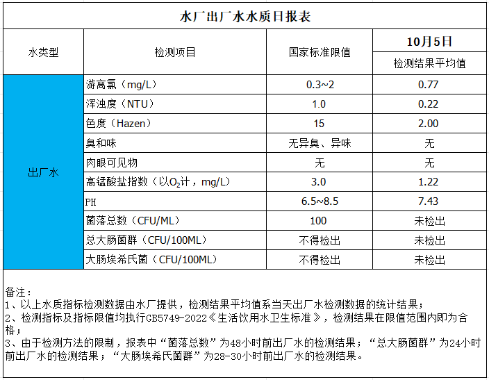 水廠(chǎng)出廠(chǎng)水水質(zhì)日?qǐng)?bào)表(2024-10-5)