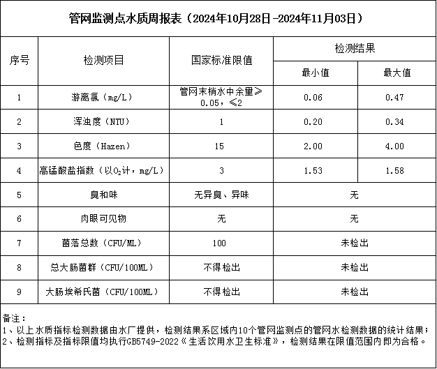 管網監測點水質周報表(2024年10月28日-2024年11月03日)