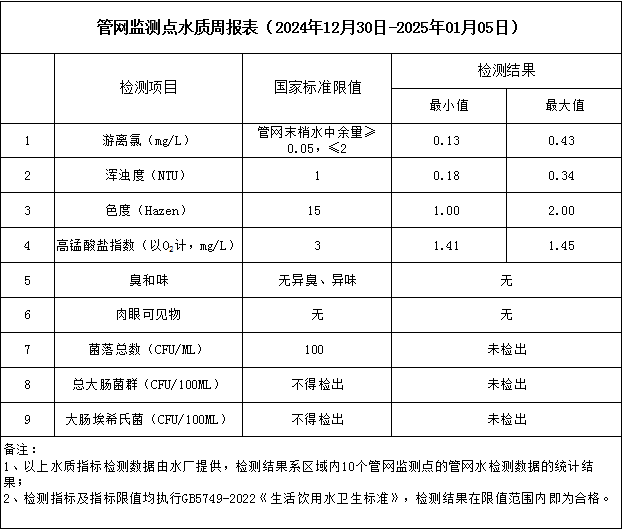 管網(wǎng)監(jiān)測點水質周報表(2024年12月30日-2025年1月5日)